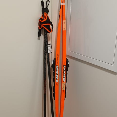 Ehjät siteet, 165cm sauvat ehjät, kunto hyvä. Toisessa suksessa osumaa.