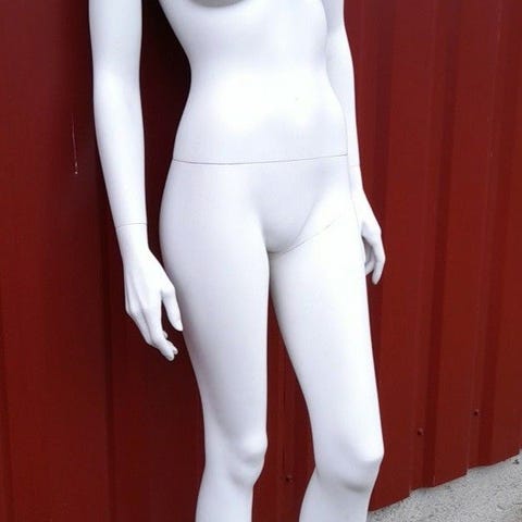 Valkoinen mallinukke. Kädet, ylä- ja alavartalo lähtevät helposti irti, myös jalusta tulee erikseen.