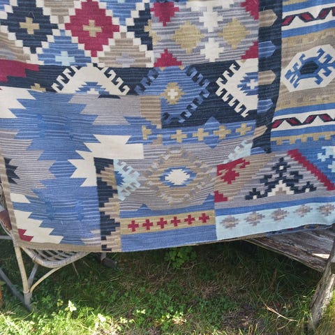 Kelim matto, villaa. Pääväri murrettu keltainen. Matto on siisti ja reunat ehjät, käytön jälkiä löytyy jonkin verran, pesua vaatii.