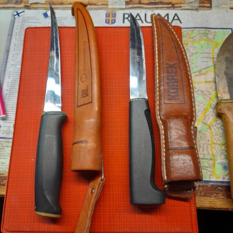 6 kpl puukkoja, 2 kpl teroituspuikkoa ja yksi Fiskarssin teroitin.