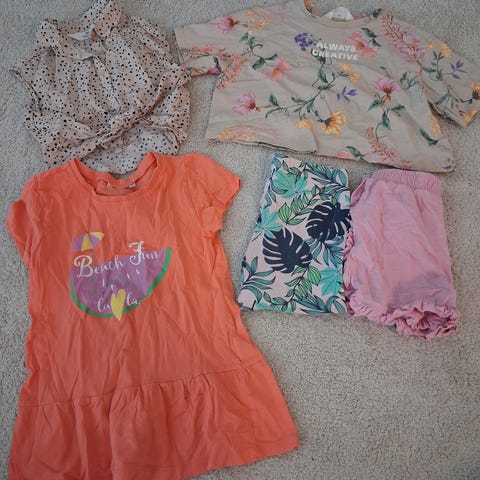 Paketissa 6 pitkähihaista paitaa, 6 housut, 3 shortsit ja yksi huppari ja 1 bolero.