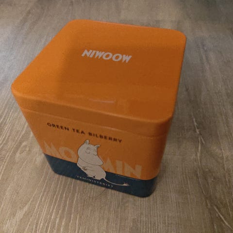 Muumi teepussien säilytys laatikko, metallinen säilytysrasia, jossa on neljä lokeroa. Laatikossa on Muumi-hahmojen kuvituksia kannessa. Koko 14x15x8cm