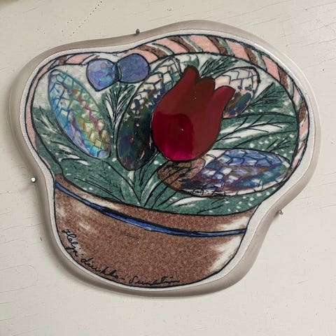Heljä Liukko-Sundströmin Arabialle suunnittelema "Tulppaaneja tulvillaan" -seinälaatta 1990-luvulta.