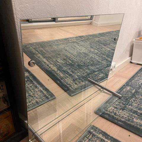 Hyvässä kunnossa oleva peili jossa lasinen hylly