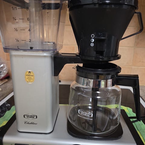 Moccamaster kahvinkeitin, tippalukolla, kullan värinen, puhdistettu ja tietenkin kunnossa.