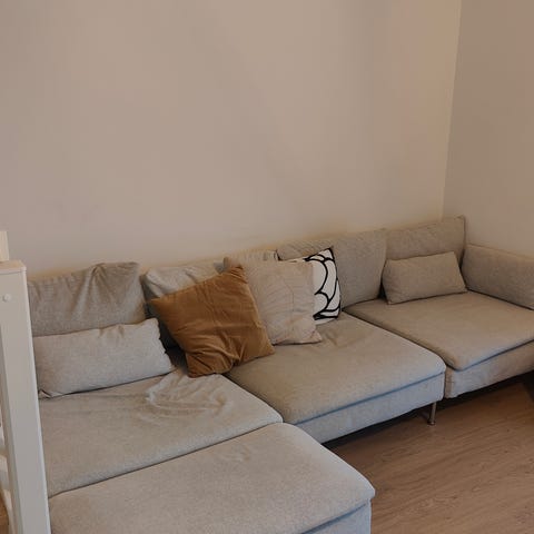 Tumman harmaa perus siisti kolmen istuttava Söderhamn sohva joka ollut vierashuoneessa. Tässä mahtuu yksi nukkumaan hyvin ja muutenkin kivan rento löhösohva. Irrotettavat pestävät päälliset, joissa näkyy hieman nukkaa mutta siisti silti.