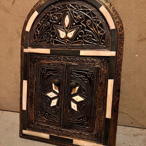 Myydään aivan uusi marokkolainen sisustusesine / peili. Valmistettu käsityönä ja valmistuksessa käytetty mm. saksanpähkinäpuuta. Leveys noin 32cm ja korkeus noin 45cm, peilin koko leveys 21cm ja korkeus 22cm. Peiliä voi pitää esim. pöydällä seinää vasten, tai sen voi helposti ripustaa seinälle sen takana olevan kiinnikkeen/hakasen avulla. Peili on arvokas sen laadukkaiden materiaalien ja arvokkaan käsityön johdosta.