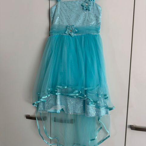 Kaunis Belle-prinsessan mekko. Koko 122-130. Siisti ja ehjä. Jokunen pieni tahra, ei näy jos ei etsi. Piilovetoketju ja muhkea laskos.