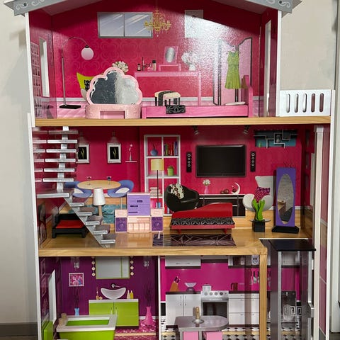 Kiva kolmikerroksinen, muotinukkejen kotina toiminut talohylly. Korkeus riittää barbielle ja isoille lol-nukeille. Rappuset saa irti.