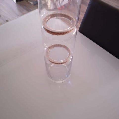 Suuri lasi maljakko/ruukku. Korkeus 90cm, leveys päältä 24,5cm. Näitä neljä kappaletta, kappalehinta 5€