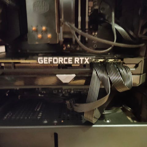 - Näytönohjain on melkein eniten kellotettu 3080, Gigabyte RTX 3080 Aorus Master 10 gb, jossa upea led-näyttö ja led-valot kyljessä. Tähän saa peräti 4 näyttöä kiinni, 3 DP-porttia ja 3 HDMI.