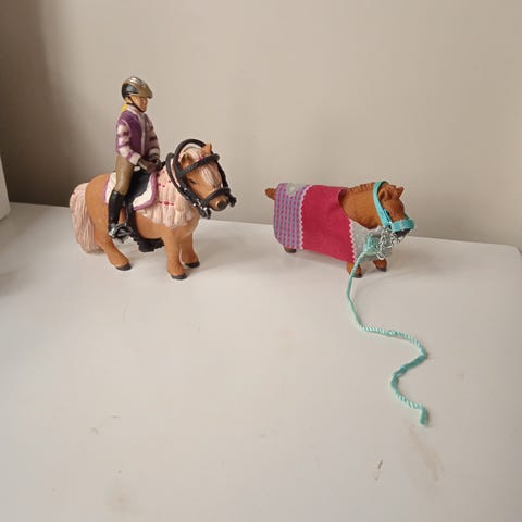 Hyvä kuntoinen setti, mukana tulee ratsastaja, hevonen, satula, suitset, riimu ja loimi kaikki hyvä kuntoisia. Nouto tai postitus.