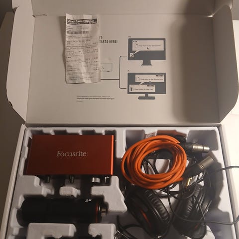 Mukana Focusrite äänikortti, mikki ja studiokuulokkeet