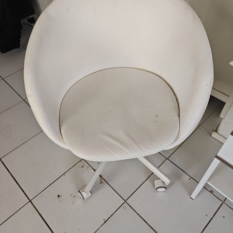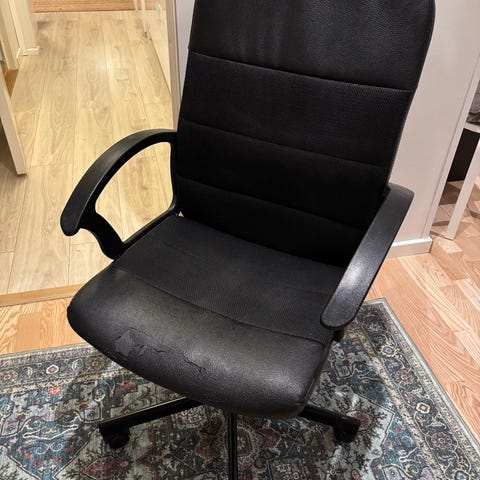 Annetaan Ikean toimistotuoli. Pinnoite on jonkin verran kulunut ja jotkut pyörät vähän jumissa.
