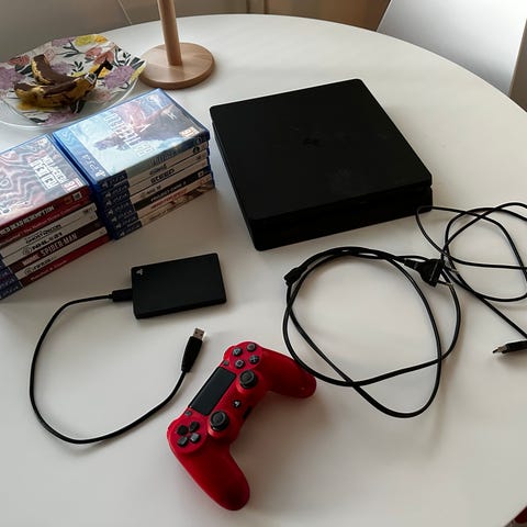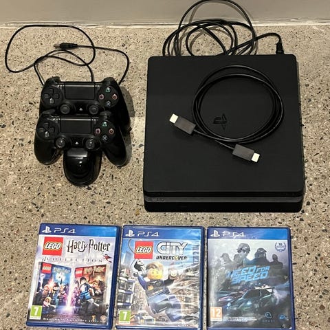 Myydään PS4 Slim pelikonsoli. Mukaan 2 ohjainta ja hdmi-kaapeli.