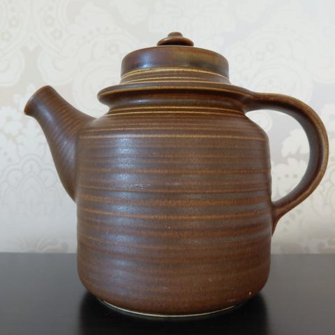 Myydään vanha, uudenveroinen suuri ruskea teekannu. Kaunis maalauskuvio.