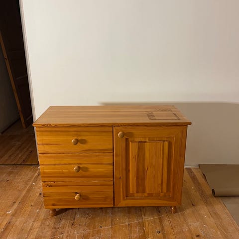 Vetolaatikollinen lipasto, kiiltävä pinta.