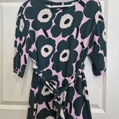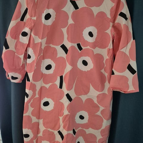 Marimekon unikkomekko (valkoinen pohja, kukissa sinistä, vaaleanpunaista ja hieman vihreää). Kunto oikein hyvä, siisti.