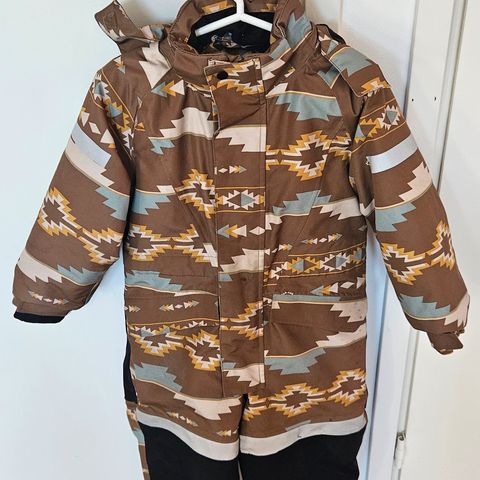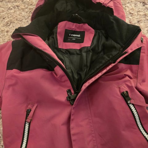 Lämmin ja kaunis Everest toppapuku 98 cm. Yhden käyttämä, polvet ja peppu siistit ja ehjät, mutta lahkeiden sisäsaumoista päällimmäinen kangas kulunut paikoin puhki, kts. kuvat. Kuivana pitänyt kuitenkin.