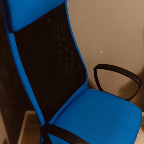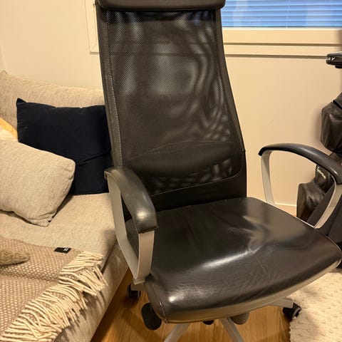 IKEA Markus työtuoli, jossa on korkeussäädettävä istuin, käsinojat ja pyörät. Tuoli on muuten hyvässä kunnossa, mutta pinnoissa on pientä käytöstä aiheutunutta kulumaa.