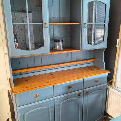 Hyväkuntoinen, käytetty emännänkaappi. Alakaapissa yksi hyllylevy. Yläkaapissa ei hyllylevyä. Edessä ulosvedettävä taso. Maali hyvässä kunnossa, paitsi tasolla hieman kulumaa.