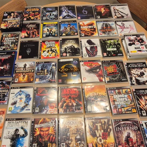 Sony Playstation 3 pelikonsoli mustana, mukana virtajohto ja ohjain + kuvassa näkyvät pelit