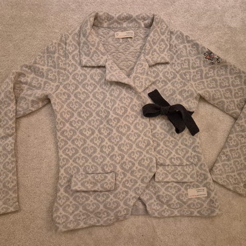 Kiva puuvillaneule, jäänyt käyttämättä. Hauskat rusetit sivuilla. Koko on tosi reilu 0, kai-kai 53 cm, pituus 57 cm.