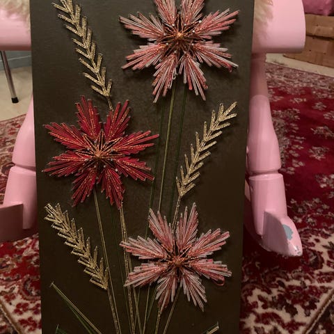 Kukka-aiheinen hopea-ruskea lankanaulataulu, tausta musta.