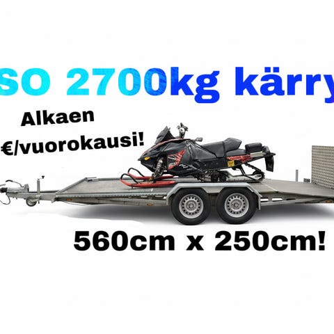 Vuokrataan jarrullinen perävaunu, jolla kuskaat jopa 1700kg massaa (esim mönkijä, avant-kuormaaja tms). Taka- ja etulaita avattavissa ja irroitettavissa. Myös kuomun saa irti tarvittaessa. Kuormausta varten saatavilla myös lastausrampit ja kuormatilasta löytyy liinoille kiristyslenkkejä reilusti.