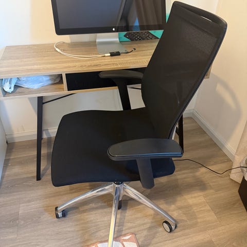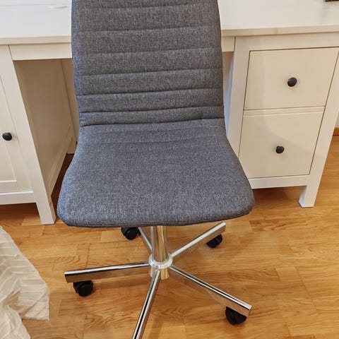 Hyvä kuntoinen harmaa työpöydän tuoli, jossa takaosassa kuviointia. Säädettävä korkeus.