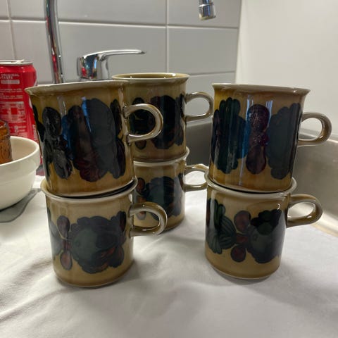 Myydään 6 kappaletta Arabia-mukeja kauniilla keltaisella kuosilla.