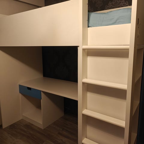 IKEA Stromsö parvisänky valkoinen ja työpöytä sekä hylly