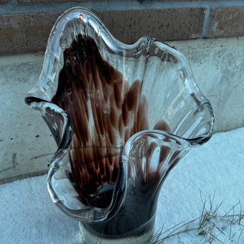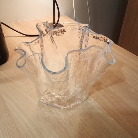 Kaunis Alla-sarjaan kuuluva lasimaljakko Elve Tautsin suunnittelema, 1990, Tarbeklaassin tehtaalta. Hinta 24e. Nouto Seinäjoki,Nurmo.