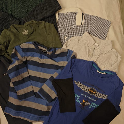 Paitoja, housuja, muutama t-paita, pari hupparia ja flanellipaita. Käytettyjä, mutta hyvä kuntoisia.