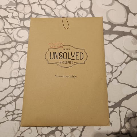 Unsolved mysteeripeli, jota voi pelata 1-8 henkilön porukalla. Tämä peli on ”Syyttömänä tuomittu”. Kaikki osaset siistejä ja tallessa. Peli on kerran pelattu läpi.