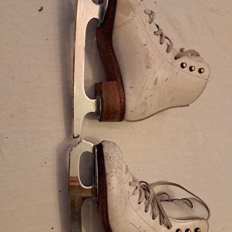 Laadukkaat luistimet, käytön jälkiä kyllä löytyy. Teräsuojat kuuluvat hintaan. Vastaava kengän koko ehkä n. 33.