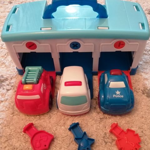 Pikkuautojen säilytykseen/leikkiin. Kaksi avattavaa ovea/sivua. Äänet toimii (torvi, moottori, valot). Naarmuja on, tarroissa sanomista, tuulilasi osin pois paikaltaan (en uskalla väkisin laittaa paikalleen). Käytettynä hankittu, leikittävässä kunnossa. Ei sisällä autoja.