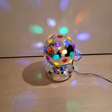Pyörivä diskopallo led valolla, moottorissa jotain vikaa, pyörii mutta haisee toimiessaan epäilyttävältä/palaneelta eli en suosittele käyttämään verkkovirrassa. Mutta muuten hieno koriste!