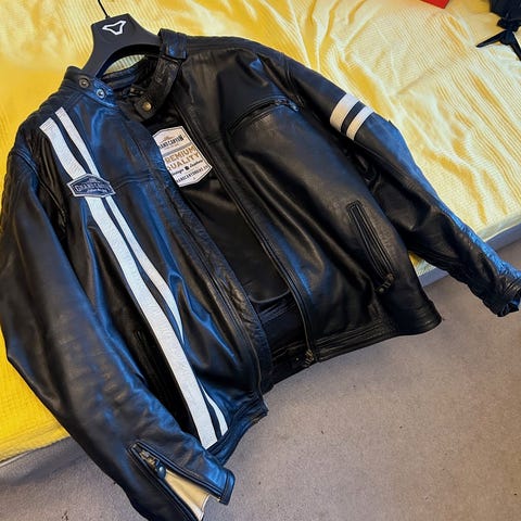 Hanxin nahkatakki selkäpanssarilla. Ehjä mutta itikanjäämiä rinnuksilla jotka piukassa. Kokoa 64, kuvassa puettuna 186cm /95kg ja istuu hyvin