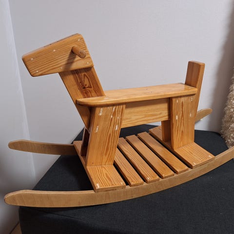 Takajalat vaativat liimausta. Pieniä kynän jälkiä päässä. Muuten toimiva keinuheppa.