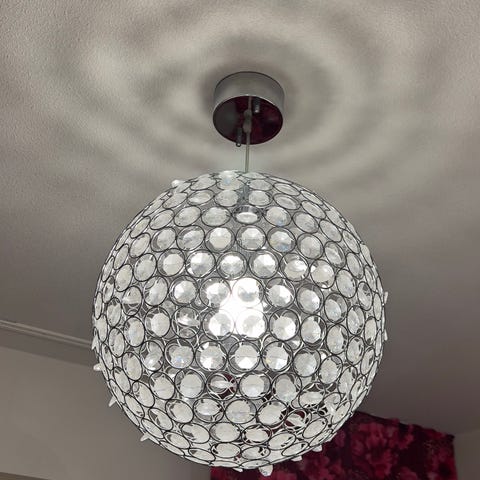 Pyöreä kattovalaisin, jossa on kristallipalloaiheinen pinta. Valaisin on suunniteltu ripustettavaksi kattoon ja se levittää valoa tasaisesti ympärilleen. Sopii erilaisiin sisätiloihin, joissa halutaan koristeellinen ja valoa heijastava valaistus.