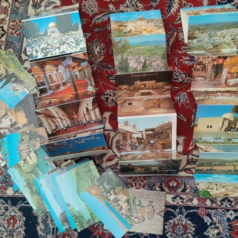 3 Jerusalem-korttia ja Land Kanaan -kortti. Kaikki kulkeneita 1970-luvulla. Suomalaiset postimerkit