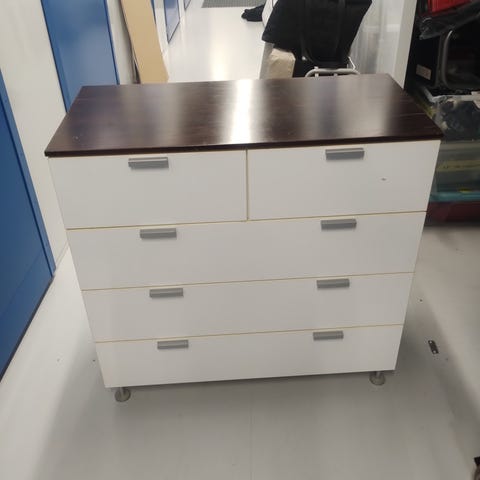 Valkoinen puinen lipasto, jossa kuusi laatikkoa. Sopii säilytykseen eri tiloissa kuten makuuhuoneessa tai toimistossa.