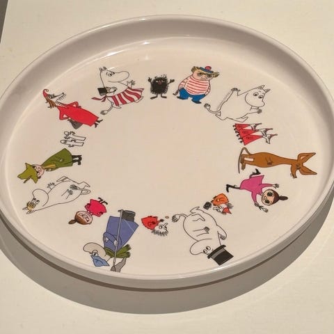 Moomin by Martinex matala (20cm) ja syvä (17cm)lautaset ja kaksi Hackamannin Muumi sarjan pikkulusikkaa, Mummola käytössä olleet.