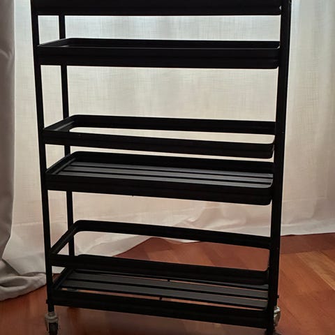 Musta metallinen ritilähylly. Mitat: kork899cm, leveys 60cm, hyllyn syvyys 13cm. Muistaakseni ritilä on Granitista.
