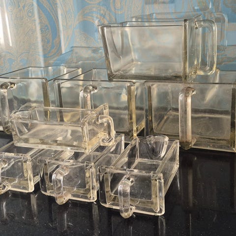 Lokerikossa yhteensä 10 lokeroa ja 2 pulloa. Pullot lasisia. Lokeroista osa muovisia ja osa lasinen joka on hankittu jälkeenpäin. Tästä puuttuu reunasta pieni pala mutta ei haittaa käytössä.