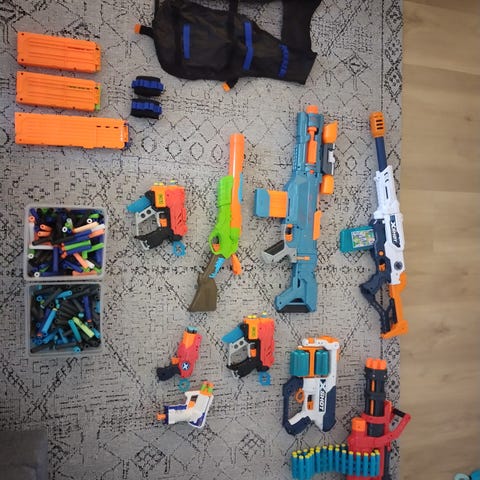 Nerf ja x-shot lelupyssyjä, ritsa+2kpl palloja ja panoksia. Vähän leikitty. Nerf leluaseita 8kpl, 1 nerf ritsa, 1kpl ammusvyö sekä 2kpl x-shot leluaseita. Panoksia molemmista merkeistä