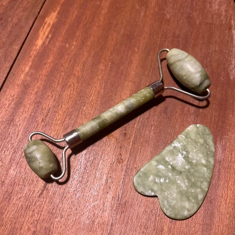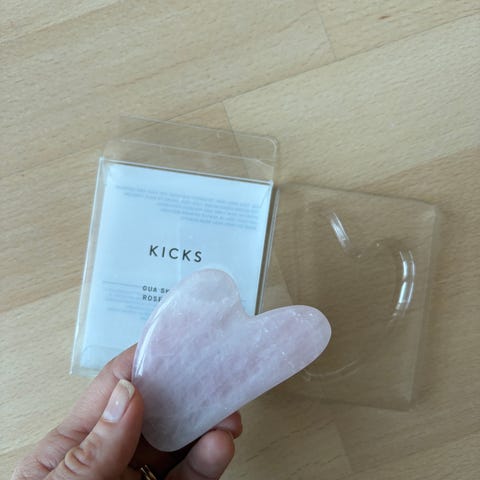 Ruusukvartsi gua sha, joka näyttää kauniilta, sopii käteen ja sillä voi hieroa niin kasvot kuin koko vartalon. Se on myös hygieeninen, koska sitä on helppo pestä saippualla käytön jälkeen.