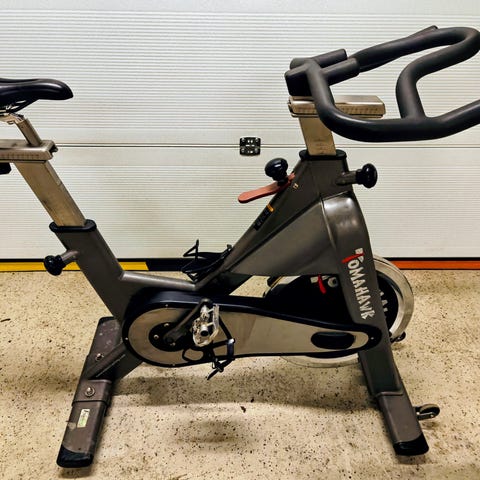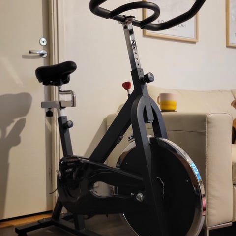 Toimiva Gymstick spinning. Säädettävä penkki ja ohjaustanko. Polkimissa toisella puolella lukot ja toisella puolella tasainen pinta eli voi polkea myös normaali kengillä.