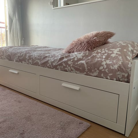Sängyn tiedot: https://www.ikea.com/fi/fi/p/brimnes-sohvasaengynrunko-jossa-2-laatikkoa-valkoinen-00228705/